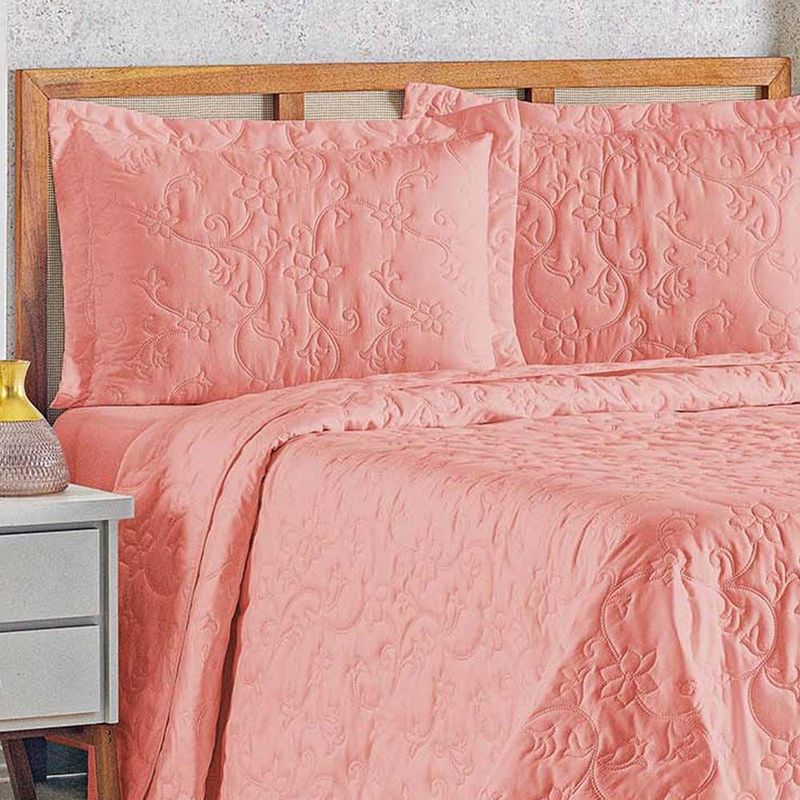 Kit Cobre Leito Colcha Celeste Queen 3 Peças Matelado Floral 180 Fios - Salmão