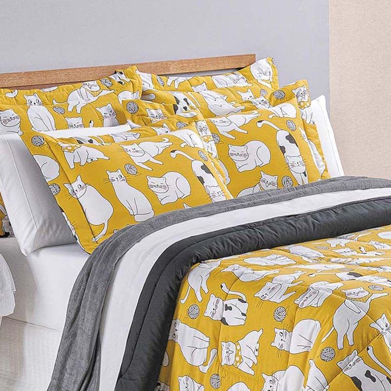 Ideal para quem ama estampas divertidas e cheias de personalidade, este kit cobre leito traz charme e aconchego ao seu quarto. Confeccionado em percal 200 fios 100% algodão, proporciona um toque macio e suave, garantindo conforto em todas as estações do ano. Sua alta qualidade assegura respirabilidade e durabilidade, mantendo a sensação de frescor por mais tempo.A estampa delicada de gatinhos adiciona um toque lúdico e moderno à decoração, tornando o ambiente mais acolhedor e estiloso. Além disso, o acabamento matelado confere um visual sofisticado, enquanto as costuras reforçadas garantem um caimento impecável, deixando sua cama sempre bem arrumada e convidativa.Contém na embalagem 03 PEÇAS,SENDO: