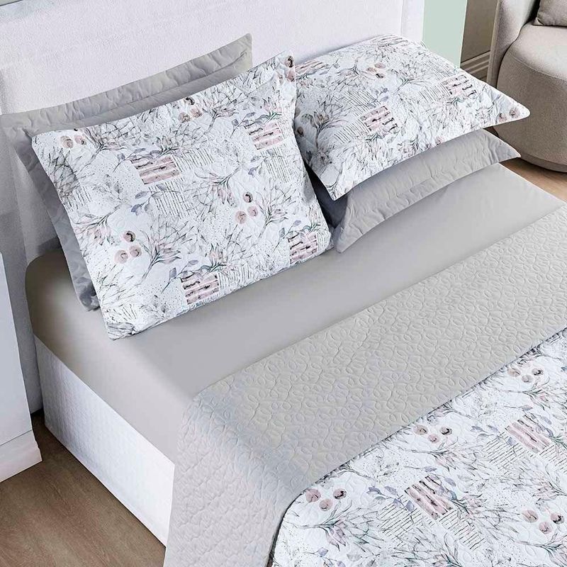 Kit Cobre Leito Colcha Maggy Queen 3 Peças Dupla Face Percale 200 Fios - Protea Floral Cinza