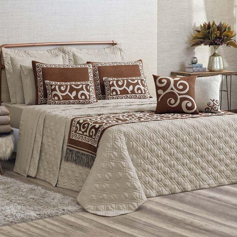 Kit Cobre Leito Colcha Tierry Queen 5 Peças Hipercal 180 Fios - Cáqui