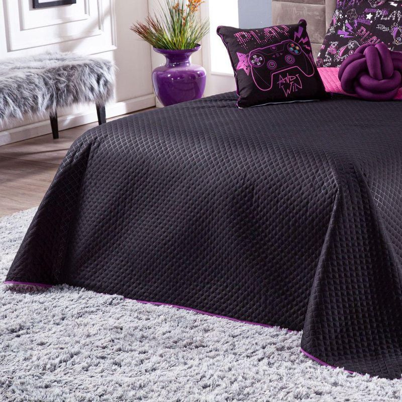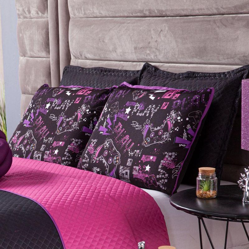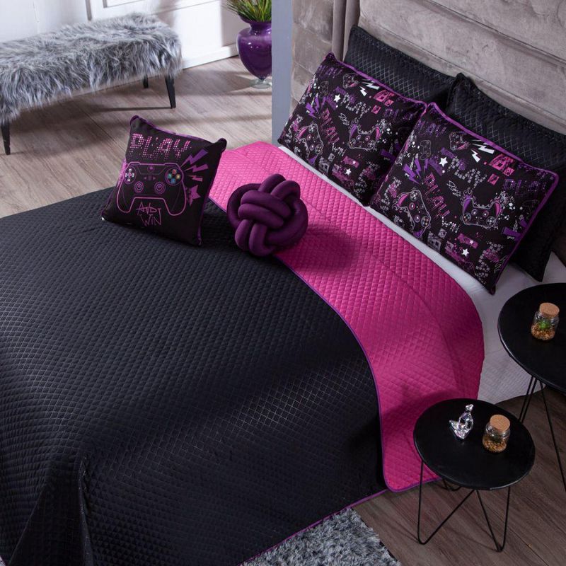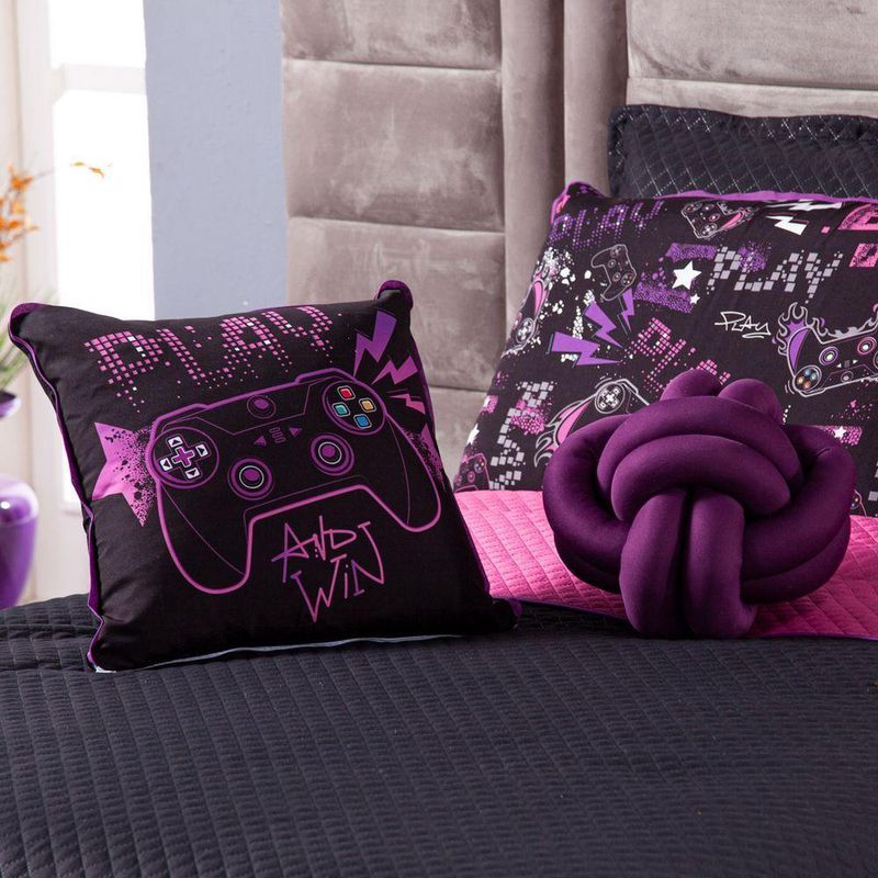 Kit Cobre Leito Game Win Preto/pink Dupla Face C/ Almofadas Casal Padrão 07 Peças