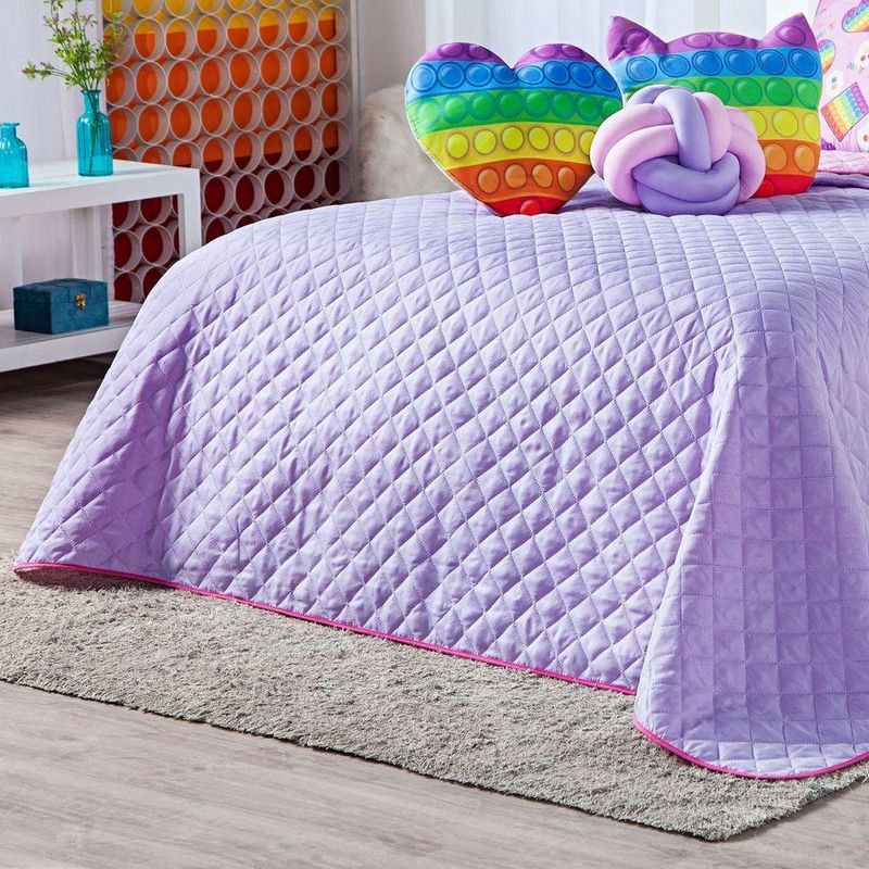A Nova Coleção Infanto-Juvenil 2021 em Microfibra tem um toque suave e macio. O tecido caracteriza-se por ser muito leve, confortável, sedoso, com secagem rápida e ótimo caimento. Vem trazendo estilo para a decoração de seu quarto na nova tendência Dupla Face, podendo utilizar as 2 cores do cobre leito! Ficará de ótimo bom gosto e elegância. Acompanhando também duas almofadinhas estampadas temáticas e uma de nó super moderna! Tudo para combinar com sua decoração. Confira! Contém 01 Cobre Leito 2,20m X 2,15m 02 Porta Travesseiros Lisos Matelados (Lilás) 70cm X 50cm 02 Porta Travesseiros Estampados 70cm x 50cm 01 Almofada Formato Gatinho Estampada 40cm x 35cm 01 Almofada Formato Coração Estampada 40cm x 40cm 01 Almofada de Nó (Tamanho aproximado de 30cm x 30cm) Composição: Tecido Superior: 100% Poliéster Microfibra Tecido Inferior: 100% Poliéster Microfibra Porta Travesseiro Liso Matelado Lilás: 100% Poliéster Microfibra Porta Travesseiro Estampado: 100% Poliéster Microfibra Enchimento: 100% Poliéster Composição Refil: Externo: 100% Polipropileno Enchimento: 100% Poliuretano Instruções de Uso e Lavagem: Vide etiqueta do produto. Foto meramente ilustrativa. Variação das cores podem ocorrer de acordo com o monitor.