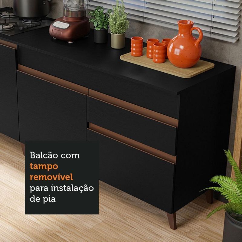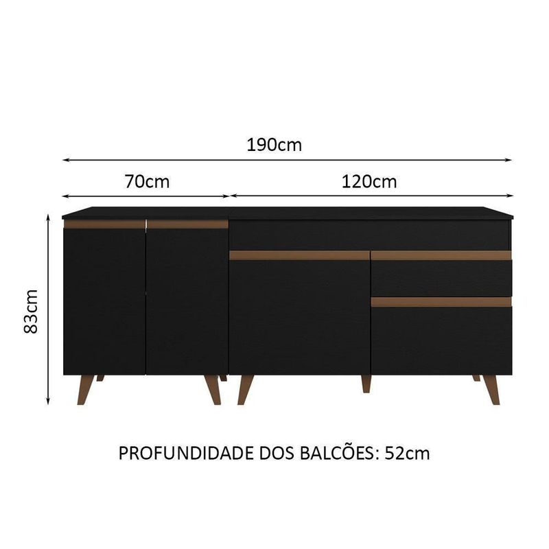 O balcão maior possui 120 cm de largura, com duas portas e uma gaveta. Além disso, o tampo pode ser removido para a colocação de pia de inox ou pedra, no espaço de 120 x 52 cm. O outro balcão possui 70 cm de largura, conta com duas portas e o tampo pode ser recortado para instalar um cooktop.