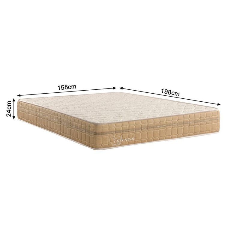 O Conjunto de Cama Box e Colchão Valência traz um toque de sofisticação e conforto para o seu quarto. Sinta a diferença que um bom descanso faz na sua vida. ?Durma bem, viva melhor?.Tipo: Conjunto Cama Box + ColchãoTamanho: QueenModelo: ValênciaCor: BegeCARACTERÍSTICAS CAMA BOX:Box Blindado com Pés (Selo SERFLOR)Estrutura de Madeira de Eucalipto - Extraída com Responsabilidade Social, 100% ReflorestadaTecido da Faixa Bordado Especial Loop.LTXPés em Madeira com ReguladoresPeso Suportado: 120kgCARACTERÍSTICAS COLCHÃO:Molas Ensacadas Individualmente180 Molas por Metro QuadradoTampo em Jacquard em Fios de LinhoFaixa de Tecido PoliésterEspuma D26Placa de Poliuretano Expansivo (6cm de EPS)Peso Suportado: 120kgDIMENSÕES DOS PRODUTOSMedidas Cama Box:Altura Total (com pés): 37cmAltura Espuma (sem pés): 24cmAltura Pés: 13cmLargura: 158cmComprimento: 198cmMedidas Colchão:Altura: 24cmLargura: 158cmComprimento: 198cmAltura Total Box com Colchão: 61cmCONTEÚDO DA EMBALAGEM:01 Box Blindado Faixa Bordada01 Colchão Valência01 Certificado de Garantia01 Manual de MontagemATENÇÃOAS IMAGENS SÃO MERAMENTE ILUSTRATIVAS E PODEM SOFRER VARIAÇÕES DE COR E PEQUENOS DETALHES DE ACORDO COM O SEU MONITOR, ILUMINAÇÃO DO AMBIENTE E ATÉ MESMO A SUA PERCEPÇÃO VISUAL.Kit Conjunto Colchão Queen Valência Molas Ensacadas Individualmente + Box Blindado 158x61x198