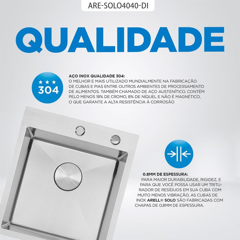 Todas as cubas de aço inoxidável da Arell possuem garantia limitada de dez (10) anos, contra eventuais defeitos de fabricação e/ou matéria prima, a partir da data da nota fiscal de compra, desde que durante utilização normal em local residencial. Caso sejam instalados em local público ou comercial, os produtos passam a ter cinco (5) anos de garantia contra eventuais defeitos de fabricação e/ou matéria prima, a partir da data da nota.