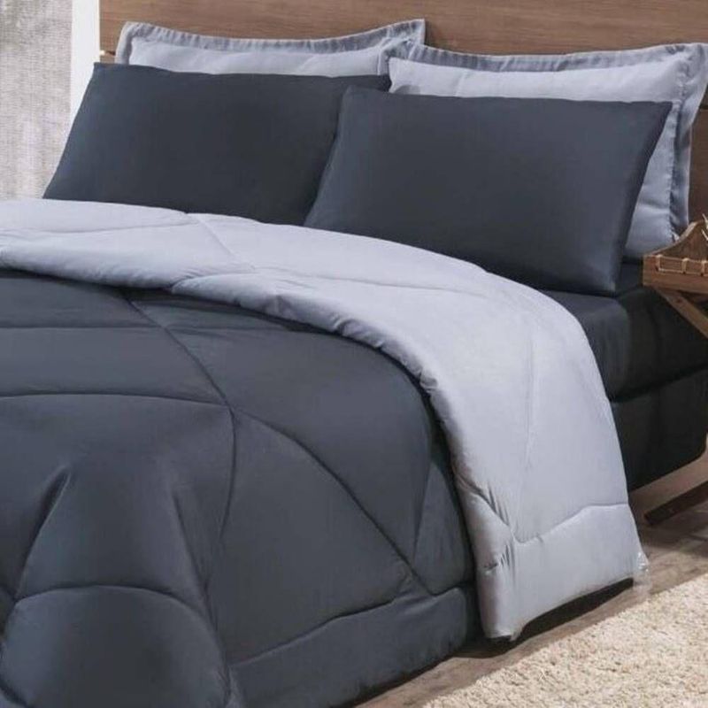 Kit Edredom + Jogo De Lençol Aconchego Look House Dupla Face Casal King 06 Peças - Preto/ Cinza
