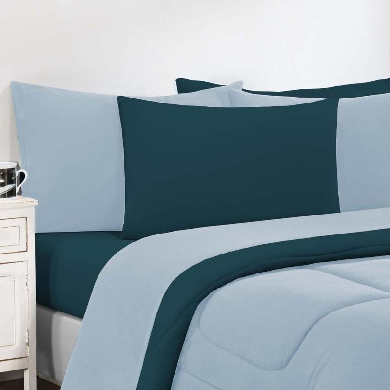 Kit Edredom + Jogo De Lençol Malha 100% Algodão Gran Moratta 7 Peças Casal - Azul Bebê/azul Petróleo