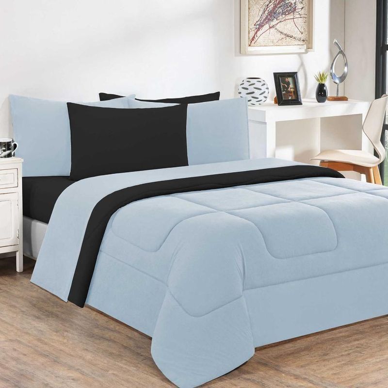 Kit Edredom + Jogo De Lençol Malha 100% Algodão Gran Moratta 4 Peças Solteiro - Azul Bebê/preto