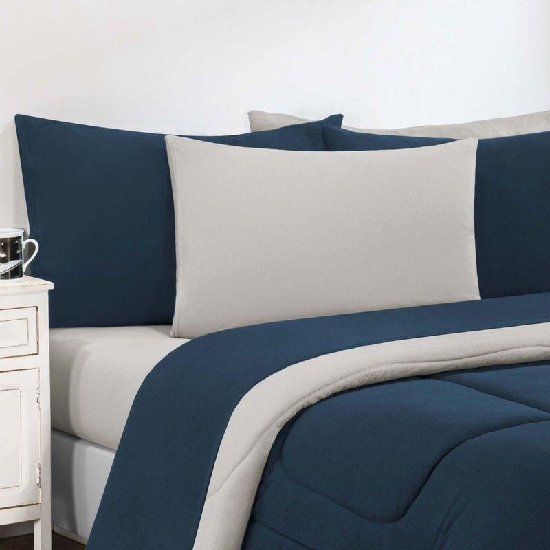 Kit Edredom + Jogo De Lençol Malha 100% Algodão Gran Moratta 5 Peças Solteiro - Azul Marinho/palha