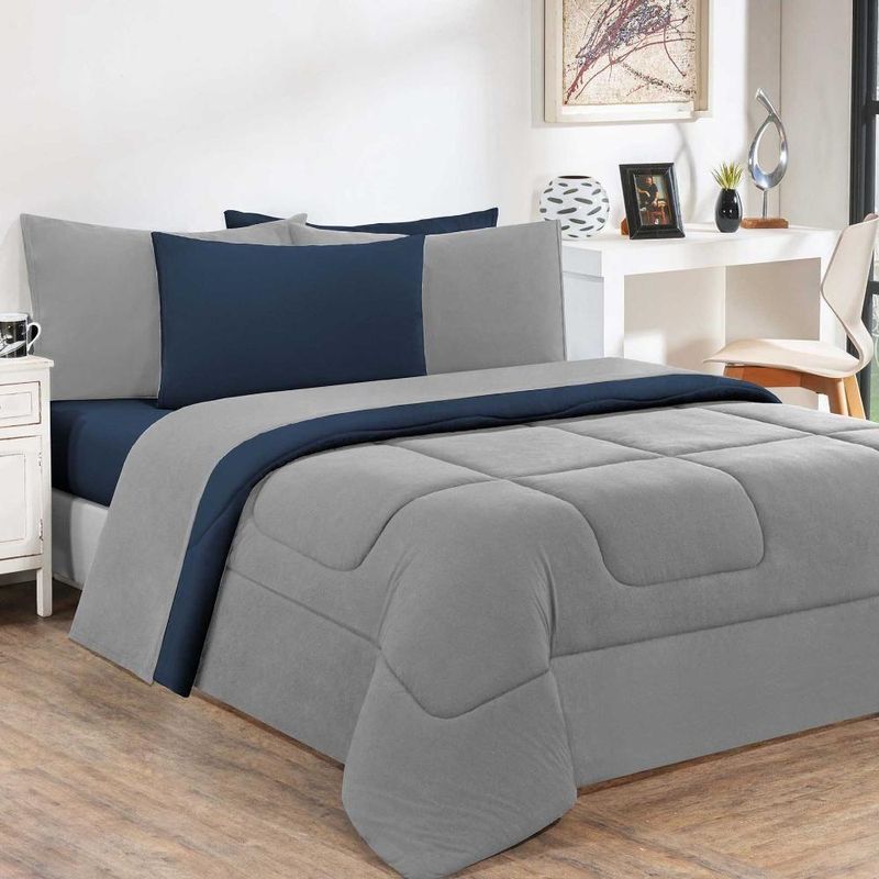 Kit Edredom + Jogo De Lençol Malha 100% Algodão Gran Moratta 6 Peças Queen - Cinza/azul Marinho