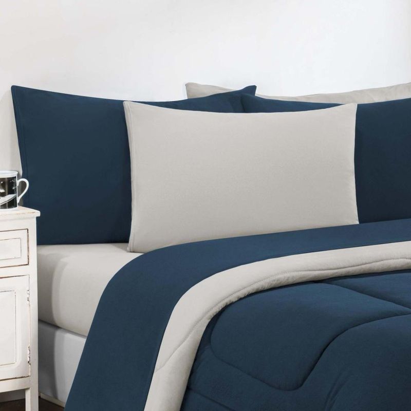 Kit Edredom + Jogo De Lençol Malha 100% Algodão Gran Moratta 7 Peças King - Azul Marinho/palha