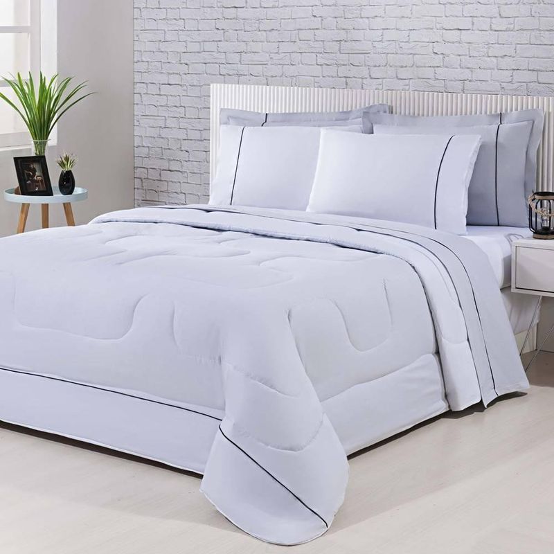O Edredom Gran Moratta é confeccionado com tecido Percal 100% Algodão, é dupla face, ou seja, pode ser usado dos dois lados, sendo um com detalhe em Vivo. O jogo de cama possui tecido Percal 100% Algodão, acompanha lençol de baixo, lençol de cima e fronhas. A combinação perfeita para suas noites de sono! Produto composto por: 01 Edredom 2,40m x 2,90m 02 Porta Travesseiro 70cm x 50cm 01 Lençol de Cima 2,40m x 2,90m 01 Lençol de Baixo para Colchão 1,93m x 2,03m x 0,40m 02 Fronhas 70cm x 50cm Composição: Percal 150 Fios 100% Algodão Enchimento 100% Poliéster (120 Gramas) Marca: Enxovais Davy | Estampa: Não se Aplica | Medidas: 01 Edredom 2,40m x 2,90m02 Porta Travesseiro 70cm x 50cm01 Lençol de Cima 2,40m x 2,90m 01 Lençol de Baixo para Colchão 1,93m x 2,03m x 0,40m02 Fronhas 70cm x 50cm | Número de Peças: 07 Peças | Material: Agodão | Cor Predominante: Branco/ Cinza | Cama Indicada: King