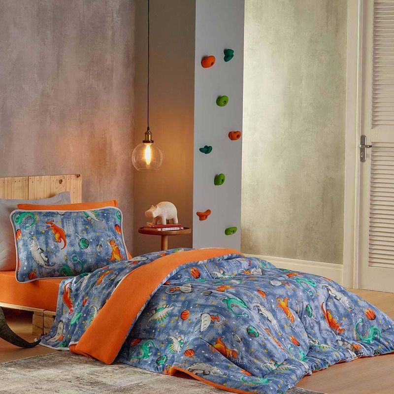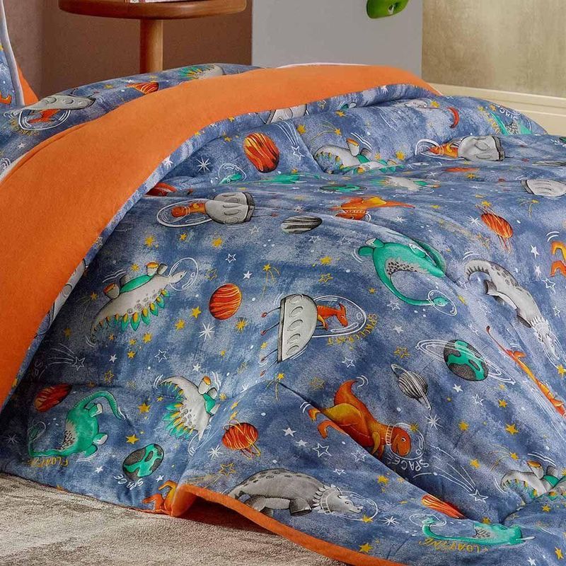 Kit Edredom Alegria Dupla Face Solteiro 2 Peças Malha Estampada 100% Algodão - Dino Space
