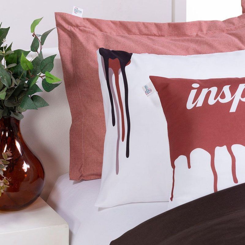 O edredom apresenta um design dupla face: uma face combina linho com tecido Hipercal 400 fios em cores contrastantes, enquanto a outra face é exclusivamente em tecido Hipercal 400 fios. Conta com manta interna presa em toda a lateral para evitar embolamento no dia a dia ou durante a lavagem. A fronha e a capa de almofada estampadas adicionam um charme especial, enquanto o porta-travesseiro em linho com debrum harmoniza com o tom marcante do edredom.