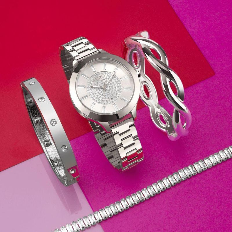 plaintext_description_meli - Kit Euro Feminino Soul Prata - EU2035YVU/K4KOs kits Euro Soul saem do óbvio e trazem lindas combinações para os looks do dia dia. Relógios com novas caixas, com mostradores trabalhados e acessórios desenvovidos exclusivamente para a marca. Trazemos duas caixas redondas, uma em banho prata e uma em banho dourado e um modelo em caixa quadrada dourado para todos os estilos.