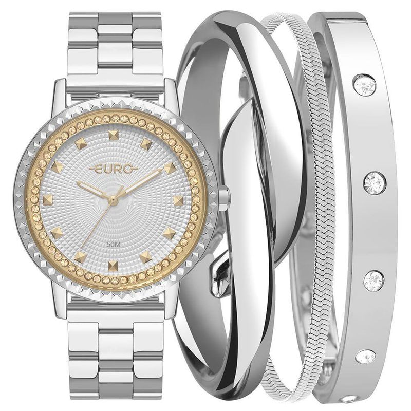 plaintext_description_meli - Kit Relógio Euro Feminino Soul Prata - EU2036YVK/K4KModelos que já brilham na versão solo, chegam na coleção Soul com kits de pulseiras que fazem a diferença. Relógio com pulseira em 3 links, banho prata, com detalhes de pedras e textura no mostrador e aro!