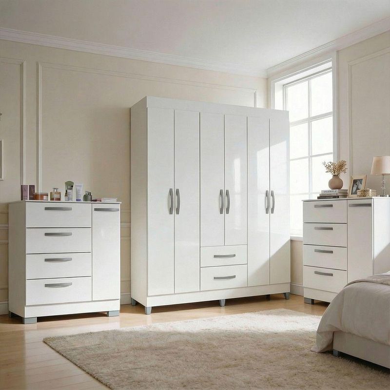 O Kit Guarda-Roupa Atenas com 02 Comodas Elena Poquema e a escolha ideal para quem busca maxima organizacao e praticidade no quarto. O conjunto reune um guarda-roupa amplo e duas comodas, oferecendo grande capacidade de armazenamento para roupas, acessorios e objetos pessoais. A distribuicao interna do guarda-roupa facilita a separacao dos itens, enquanto as duas comodas ampliam as possibilidades de organizacao, tornando o ambiente mais funcional, organizado e confortavel para o dia a dia.