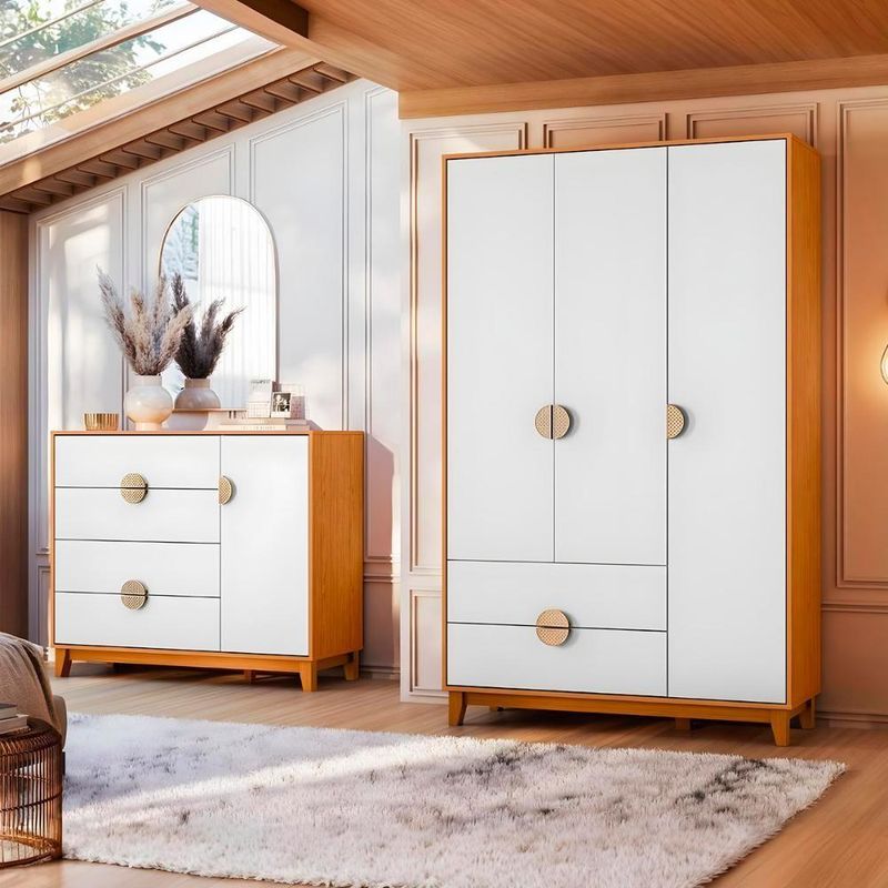 Kit Guarda Roupa Ipê Com Comoda Ipê Com Pés Madeira Maciça Cinamomo/Branco