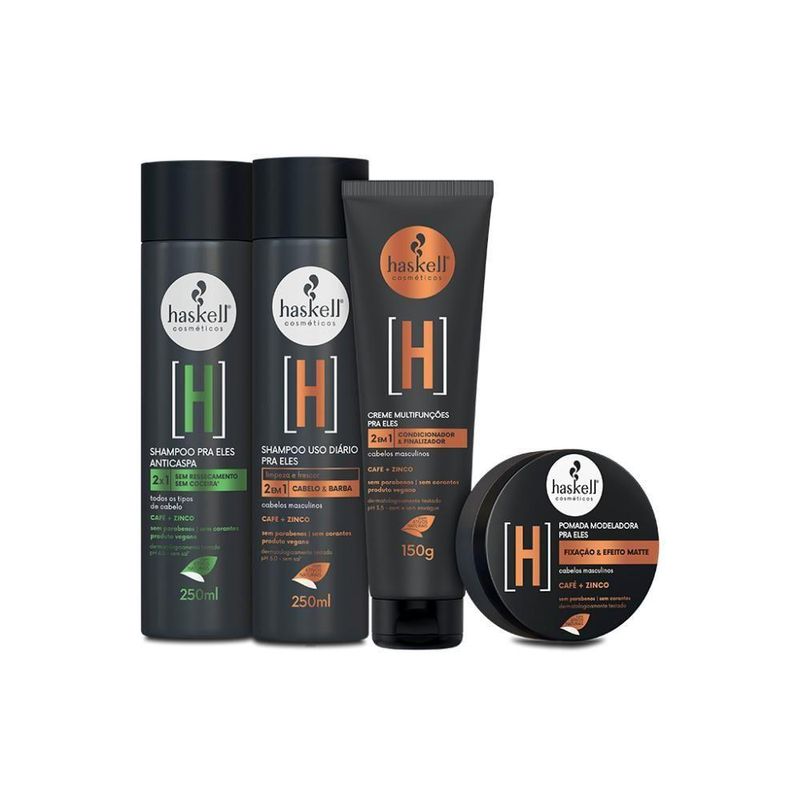 A linha H da Haskell é uma linha completa de cuidados capilares criada especialmente para o tratamento do cabelo masculino. Desenvolvida com café e zinco, esta linha proporciona força e vitalidade, além de oferecer brilho e hidratação ideais para os cabelos dos homens. O Kit H Completo Haskell é composto por:Shampoo Anticaspa H 300mlShampoo Uso Diário H 300mlPomada Modeladora H 55gCreme Multifunções H 150g Direção olfativa: Amadeirado aromático âmbar. Indicação: Cabelos masculinos. DÚVIDAS FREQUENTES: Qual a validade do produto? Haskell tem validade de 2 anos a partir da data de fabricação.Tem em estoque? Temos todos os nossos produtos disponíveis para envio imediato.Produto Legítimo? Adquirido diretamente do distribuidor autorizado Haskell.Atendimento personalizado? Elaboração de kits sob medida. OBSERVAÇÕES SOBRE A COMPRA: Mimos e + mimos e com o pedido sempre tem um cupom! Sabia!? Compras efetuadas até as 14 hrs serão enviadas no mesmo dia.Compras efetuadas sexta-feira após as 14 hrs serão enviadas no dia útil seguinte.Todos os produtos são enviados com nota fiscal.Caso seu produto chegue danificado não se preocupe, fale com a gente! NA