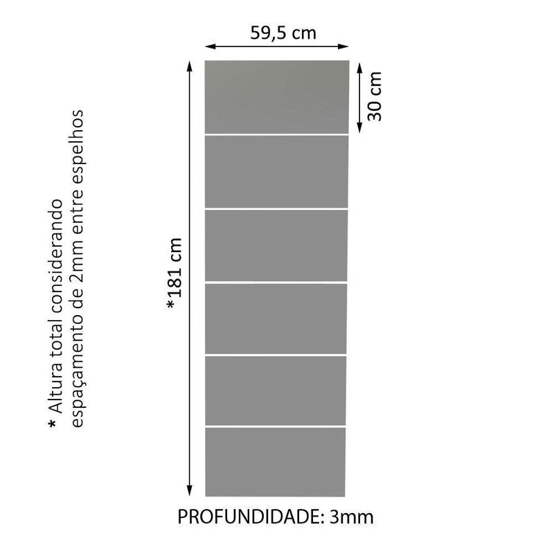 Itens inclusos:- Seis (6) espelhos de 30 cm de altura x 59,5 cm de largura e 3 mm