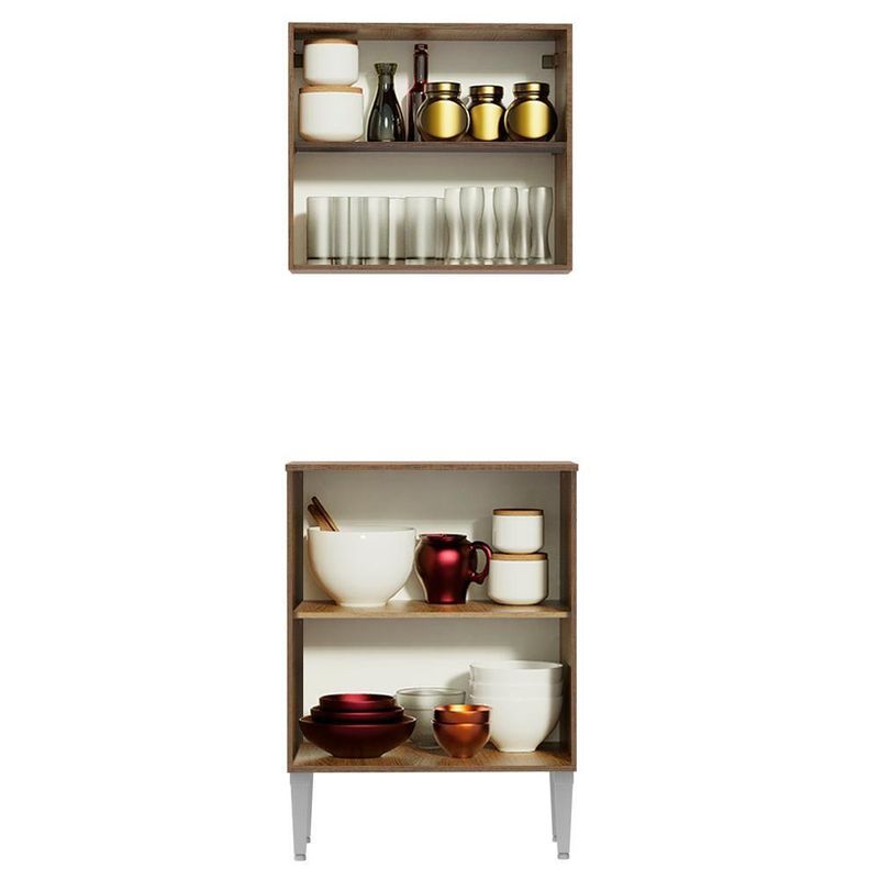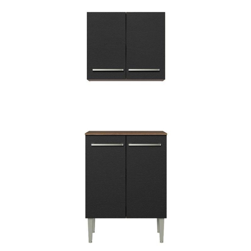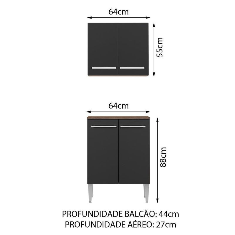 - Um Balcão de 88 cm de altura x 64 cm de largura x 44 cm de profundidade com prateleira interna e duas portas e tampo.Tanto o armário aéreo quanto o balcão possuem dobradiças metálicas resistentes e puxadores com alumínio. Com espaço interno bem distribuído, são ideais para a organização de louças, eletroportáteis, mantimentos e o que mais você preferir. Os pés em PVC possuem regulagem para ajustes de pequenos desníveis do piso.O acabamento da estrutura é em amadeirado Rustic. As portas são pretas e a parte interna das costas é branca. O processo é feito em Pintura Poliéster ecológica de alta resistência, detalhe que confere maior qualidade e durabilidade ao produto.Imagens meramente ilustrativas: a decoração não acompanha o produto.Código do produto: G200917KObs.: O armário aéreo precisa ser fixado na parede. A Madesa não disponibiliza serviço de montagem. O produto segue com manual de instalação e todas as ferragens necessárias para sua montagem.Marca: MADESA