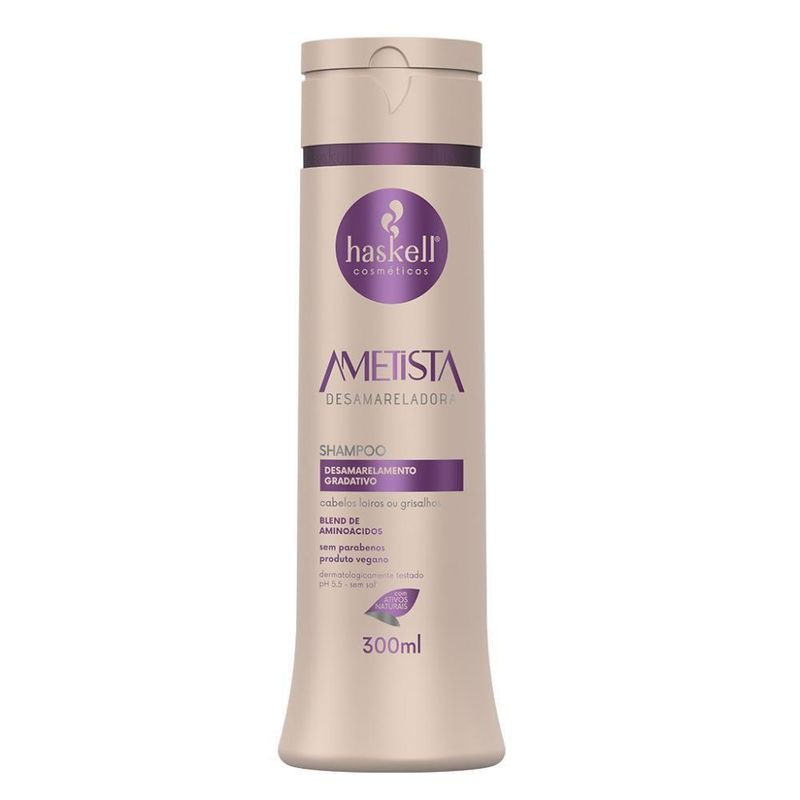 O Kit contém Shampoo, Condicionador e Máscara de Tratamento da linha Desamareladora Ametista, desenvolvida especialmente para cuidar dos cabelos loiros, descoloridos ou grisalhos. A linha promove desamarelamento gradual e regulagem da cor por meio do seu uso contínuo. Com a presença da Ametista, uma pedra preciosa com propriedades intensificadoras de brilho, associada ao blend de aminoácidos e outros ativos, proporciona luminosidade, resistência e hidratação aos fios. O kit contém: Shampoo 300ml Condicionador 300ml Máscara de Tratamento 300g Benefícios: Desamarelamento gradual para cabelos loiros, descoloridos ou grisalhos. Regulagem da cor por uso contínuo. Intensifica o brilho dos cabelos. Proporciona luminosidade, resistência e hidratação. Direção olfativa: Amadeirado cítrico. Indicação: Para cabelos loiros ou grisalhos. DÚVIDAS FREQUENTES: Qual a validade do produto? Haskell tem validade de 2 anos a partir da data de fabricação. Tem em estoque? Temos todos os nossos produtos disponíveis para envio imediato. Produto Legítimo? Adquirido diretamente do distribuidor autorizado Haskell. Atendimento personalizado? Elaboração de kits sob medida. OBSERVAÇÕES SOBRE A COMPRA: Mimos e + mimos e com o pedido sempre tem um cupom! Sabia!? Compras efetuadas até as 14 hrs serão enviadas no mesmo dia. Compras efetuadas sexta-feira após as 14 hrs serão enviadas no dia útil seguinte. Todos os produtos são enviados com nota fiscal. Caso seu produto chegue danificado não se preocupe, fale com a gente! Quantidade de itens: | Volume do item: | Contém conteúdo líquido: | Principais Características do Produto 0: | Aviso de segurança: | Baterias são necessárias?: | Palavras-chave de Pesquisa: | Contagem de unidades: | Aroma: | Principais Características do Produto 1: | Informações sobre alérgenos: | Principais Características do Produto 2: | Ingredientes: | Tipo de cabelo: | Gênero do público-alvo: | Formato do item: | Preço sugerido sem impostos: | Palavra-chave do público-alvo: | O Produto pode Expirar: | Fonte de energia: | Estilo de vida: | Fabricante: