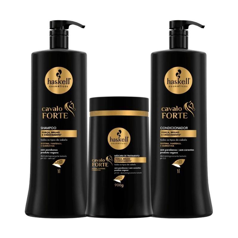 A linha Cavalo Forte foi desenvolvida para fortalecer e auxiliar no crescimento dos cabelos, especialmente para cabelos opacos e com dificuldade de crescimento. Sua fórmula concentrada possui biotina, pantenol e queratina, ativos que, juntos, promovem tratamento de alta performance que reduz o risco de quebra, reconstrói e reforça a estrutura interna do fio. Benefícios: Fortalece os cabelos. Auxilia no crescimento dos fios. Reduz o risco de quebra. Reconstrói e reforça a estrutura capilar. Kit Contém: Shampoo Cavalo Forte 1000ml Condicionador Cavalo Forte 1000ml Máscara de Tratamento Cavalo Forte 900g Indicação: Para cabelos opacos e com dificuldade de crescimento. Direção olfativa: Floral verde. DÚVIDAS FREQUENTES: Qual a validade do produto? Haskell tem validade de 2 anos a partir da data de fabricação. Tem em estoque? Temos todos os nossos produtos disponíveis para envio imediato. Produto Legítimo? Adquirido diretamente do distribuidor autorizado Haskell. Atendimento personalizado? Elaboração de kits sob medida. OBSERVAÇÕES SOBRE A COMPRA: Mimos e + mimos e com o pedido sempre tem um cupom! Sabia!? Compras efetuadas até as 14 hrs serão enviadas no mesmo dia. Compras efetuadas sexta-feira após as 14 hrs serão enviadas no dia útil seguinte. Todos os produtos são enviados com nota fiscal. Caso seu produto chegue danificado não se preocupe, fale com a gente! NA