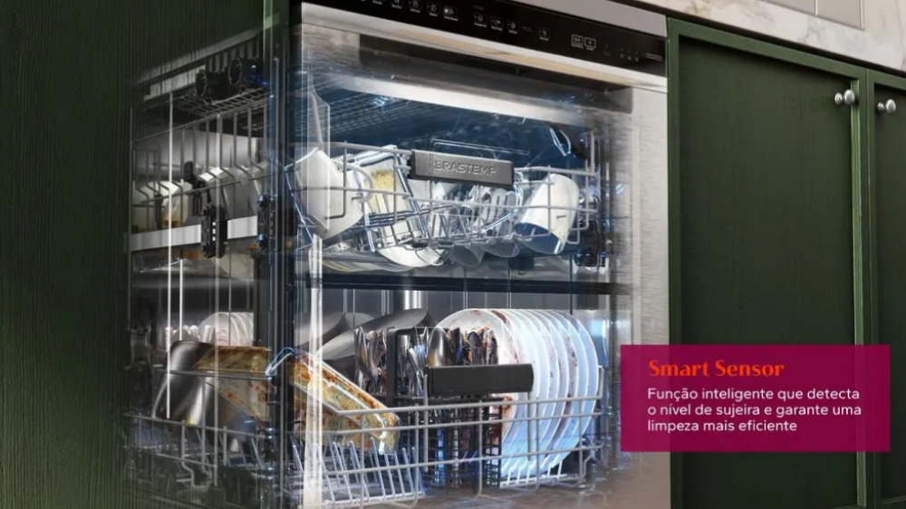 Função inteligente que detecta o nível de sujeira nas louças, calculando com precisão o tempo e quantidade de água para garantir uma limpeza mais eficiente.