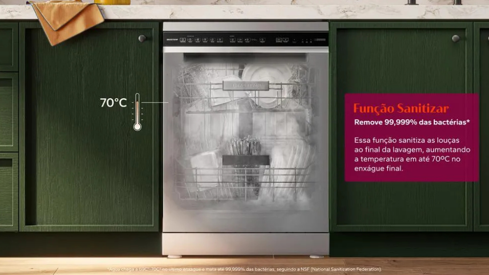 Remove 99,999% das bactérias4. Essa função sanitiza as louças ao final da lavagem, aumentando a temperatura em até 70ºC no enxágue final. Ideal para limpar e higienizar itens mais sensíveis como produtos de bebê, até louças, garrafas e outros.