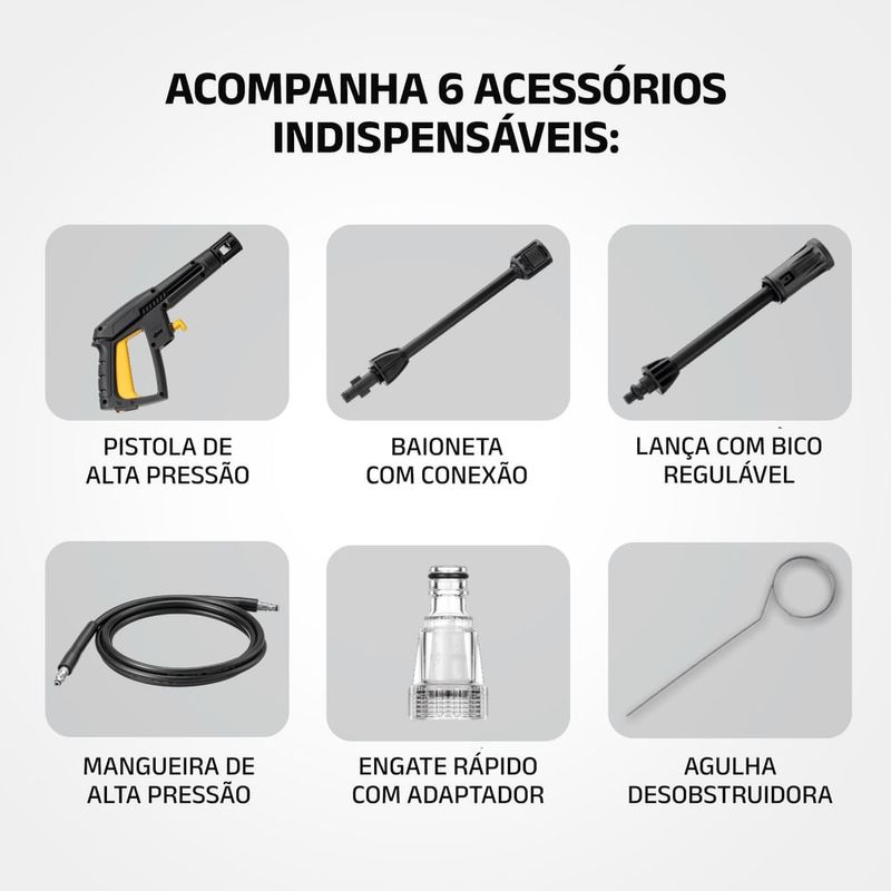 Acessórios Indispensáveis: Acompanha lança com bico regulável, engate rápido com adaptador, agulha desobstruidora, pistola de alta pressão, mangueira de alta pressão e baioneta com conexão rápida.