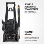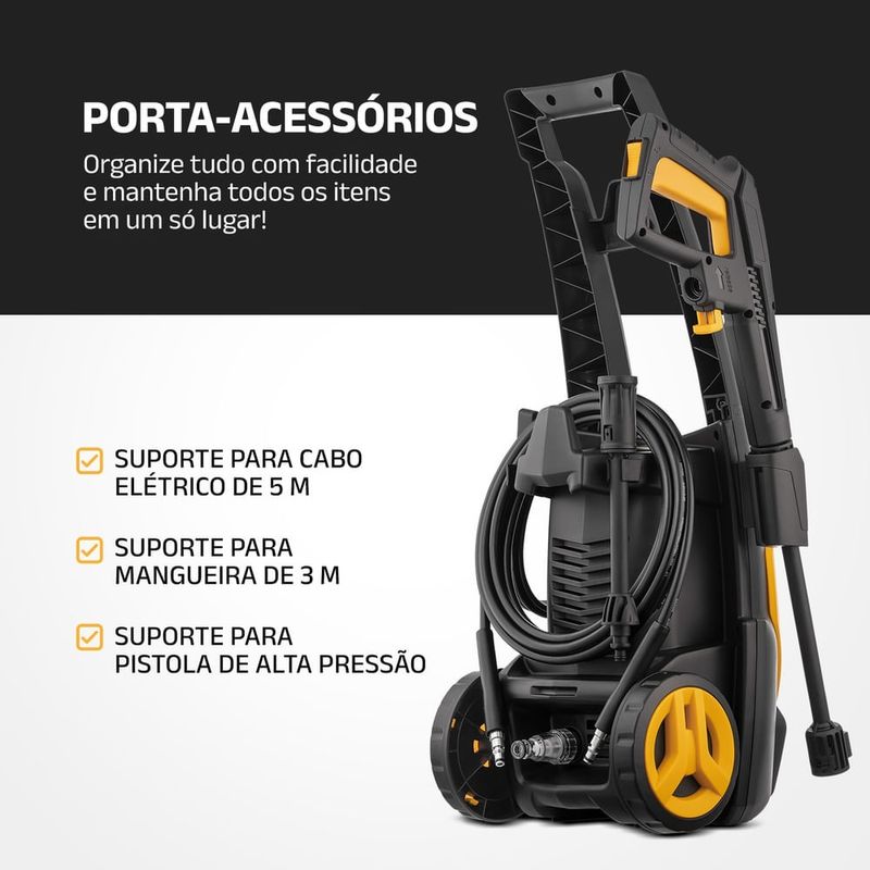 Armazenamento Prático: Organize tudo com facilidade! Com suporte para cabo elétrico, mangueira, pistola e porta-acessórios, você mantém todos os itens em um só lugar, facilitando o armazenamento do produto em espaços reduzidos.