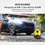 Maior Alcance e Autonomia: A lavadora da Mondial possui cabo elétrico de 5 metros e uma mangueira com 3 metros, permitindo uma limpeza super completa e sem interrupções para troca de tomada.