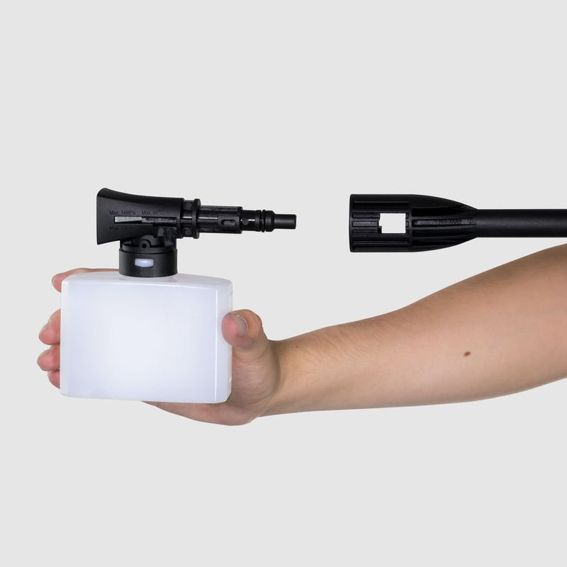 A Lavadora de Alta Pressão Karcher Compacta acompanha uma Lança de Jato Reto regulável que se adequa ao tipo de limpeza necessária, e um aplicador de detergente que torna a remoção da sujeira ainda mais simples.