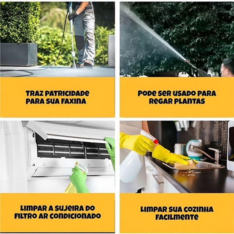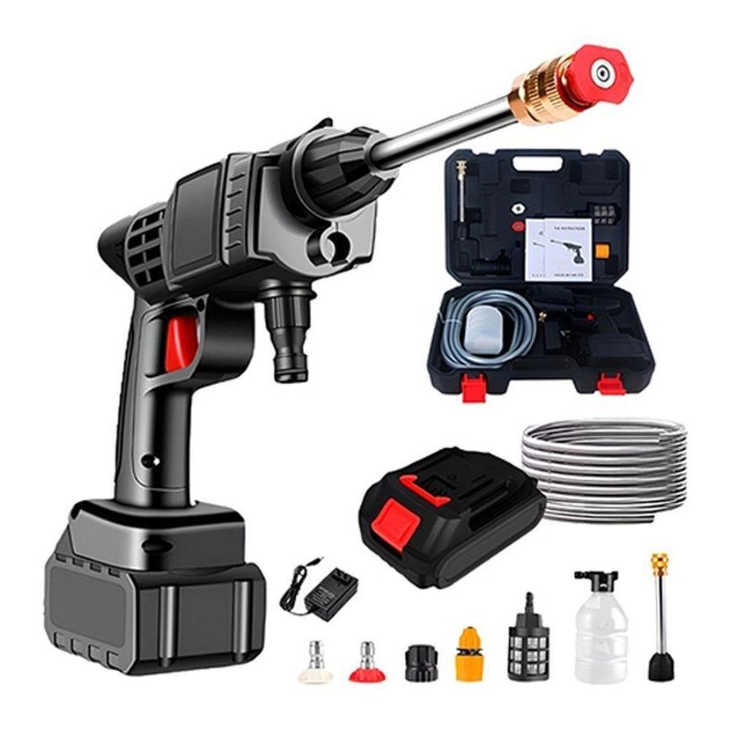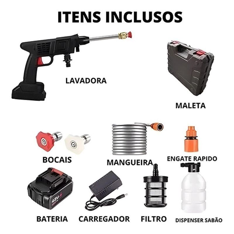 Mantenha seu veículo e seu ambiente sempre limpos com a nossa lavadora de alta pressão portátil, projetada para oferecer praticidade e eficiência em diversas tarefas. Seja para lavar carros, motos, bicicletas ou mesmo para limpar o chão e regar plantas, essa lavadora é a ferramenta ideal.Funcionalidade:A lavadora de alta pressão funciona de maneira simples e prática. Basta encher um balde com água, inserir a mangueira equipada com um filtro dentro do balde, e a pistola de pressão fará o restante do trabalho, puxando a água e liberando-a com alta pressão.Com um design portátil e fácil de manusear, esta lavadora é ideal para diferentes aplicações, desde a limpeza de superfícies até a rega de plantas. Os bocais ajustáveis permitem controlar o tipo de jato de água, adaptando-se às necessidades específicas de cada tarefa.O sistema de sucção da lavadora garante que a água seja utilizada de forma eficiente, resultando em economia de água e energia. Além disso, a praticidade de utilizar um balde como fonte de água torna o equipamento perfeito para uso em locais onde não há acesso fácil a uma torneira.Especificações Técnicas:Modelo: Lavadora de Alta Pressão Portátil Bateria Bivolt;Material: Plástico ABS + Componentes Elétricos;Cor: Preto;Tensão: 110V/220V;Comprimento da Mangueira: 5 Metros;Itens Inclusos:- 1x Maleta de Armazenamento e Transporte;- 1x Lavadora de Alta Pressão Portátil;- 1x Haste de Extensão;- 1x Mangueira de 5 Metros;- 1x Bateria 48v;- 1x Carregador p/ Bateria;- 2x Bicos de Dispersão de Água;- 1x Filtro de Captação de Água;- 1x Fixador de Mangueira;- 1x Recipiente de Sabão 300ml.