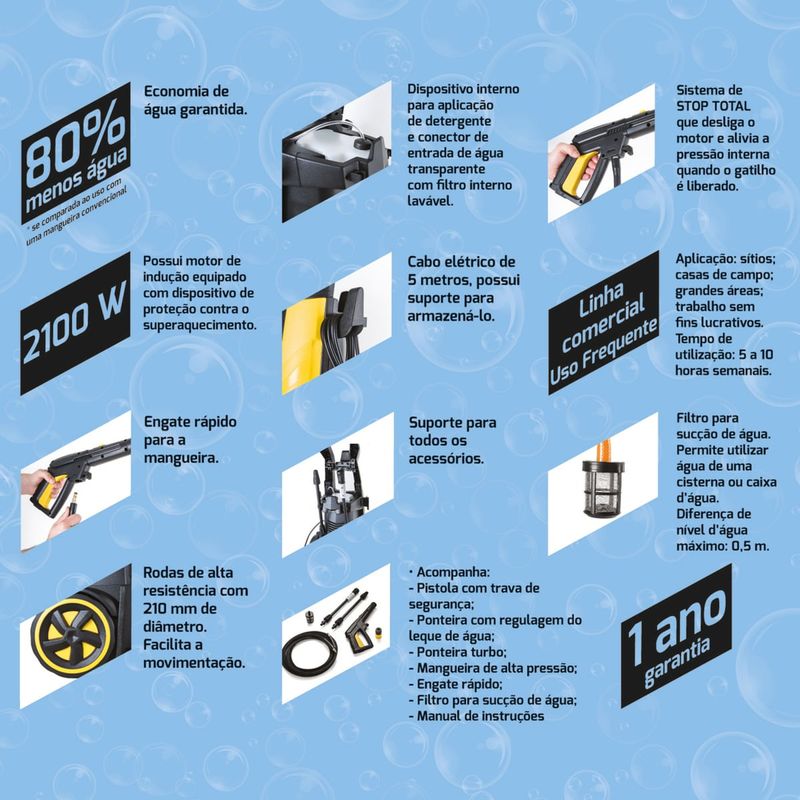Ideal para uso frequente, a Lavadora de Alta Pressão Tramontina 2100 W para Uso Comercial Frequente com Mangueira Alta Pressão 5 m Jato Regulável 2100 psi oferece praticidade, economia e uma limpeza de excelência. As lavadoras de alta pressão da Tramontina garantem uma economia de até 80% de água, se comparadas a uma mangueira convencional. Um produto de alto desempenho e qualidade, que conta com dispositivo para regulagem da saída de água em forma de jato ou leque. E para tornar o seu dia a dia mais ágil, acompanha diversos acessórios que permitem adequar a lavadora aos mais diferentes usos. Escolha a Lavadora Tramontina e sinta a diferença na sua rotina e bolso.