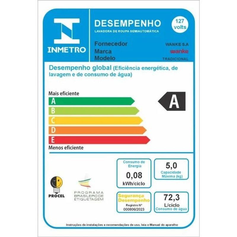 Eficiência de lavagem: 0,82 kW/h