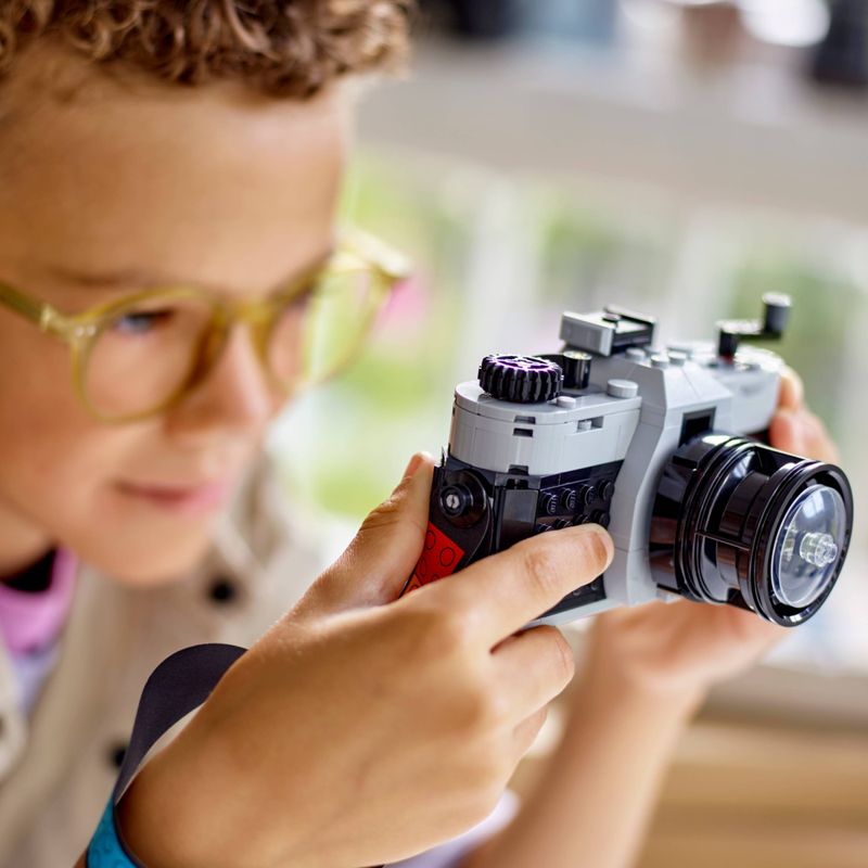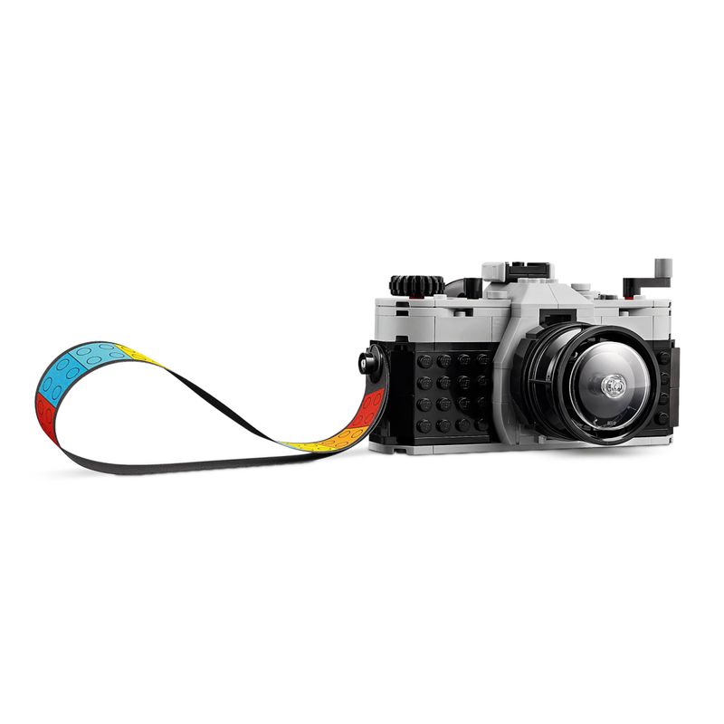 Inspire brincadeiras imaginativas com o conjunto de construção 3 em 1 LEGO® Creator Retro Camera (31147) para meninos e meninas com mais de 8 anos. Este icônico brinquedo de câmera possui uma lente móvel, botões na parte superior para tirar uma foto, uma abertura traseira para colocar um pedaço de filme feito de tijolos dentro e uma alça de tecido multicolorida para carregá-lo. Há também 6 adesivos para as crianças adicionarem ao filme para representar suas fotos.