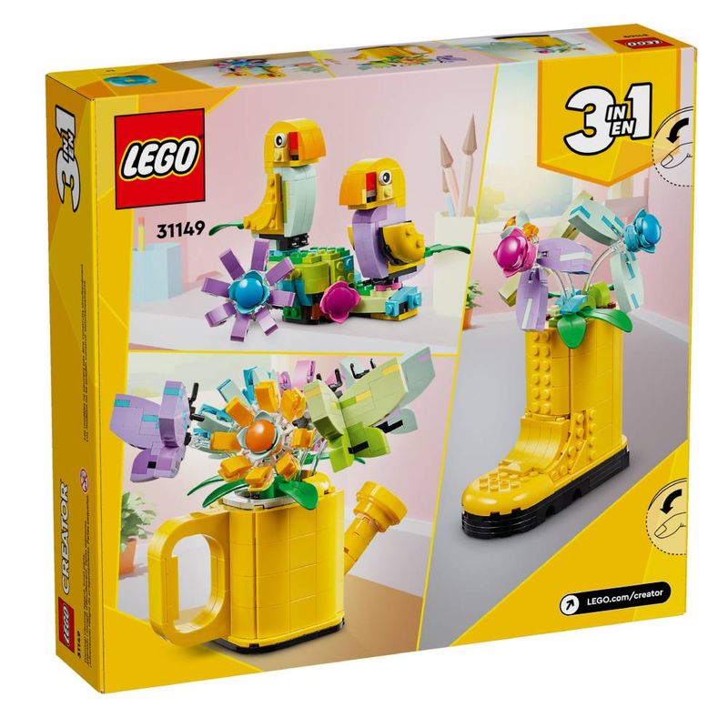 Construa, reconstrua, brinque e exiba 3 modelos coloridos inspirados na natureza com este conjunto LEGO® Creator 3 em 1 Flores em Regador (31149). Possui um regador amarelo construído em tijolos com alça e bico. É preenchido com 3 brinquedos de flores com pétalas móveis e 3 brinquedos de borboletas em palitos transparentes que dão a impressão de que estão voando.