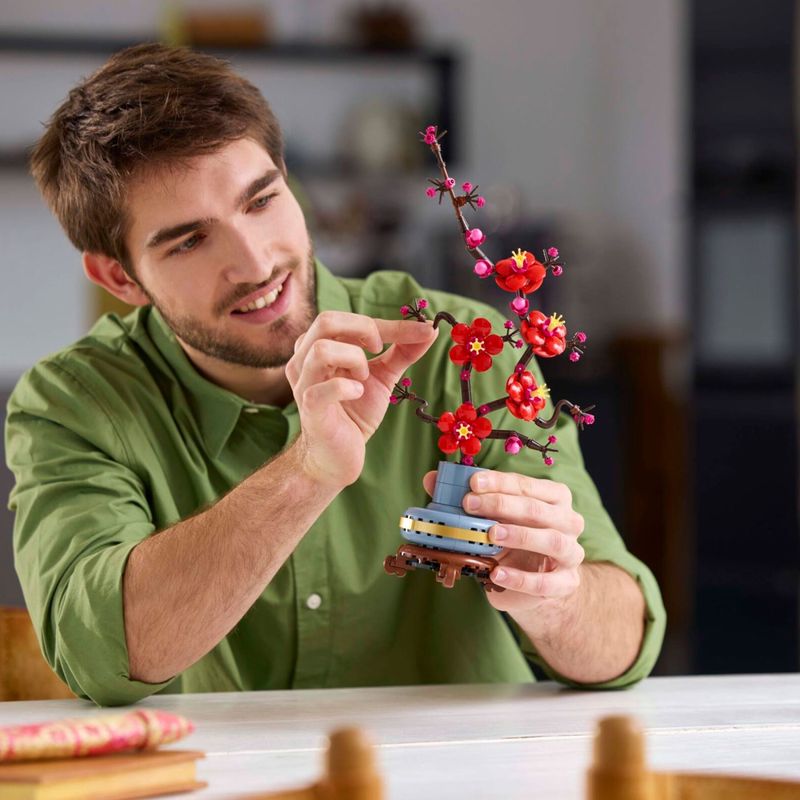 Uma ideia de presente de decoração consciente para casa O conjunto de construção LEGO® Icons Plum Blossom é uma ótima ideia de presente de aniversário ou qualquer dia para fãs adultos de conjuntos de construção LEGO e flora