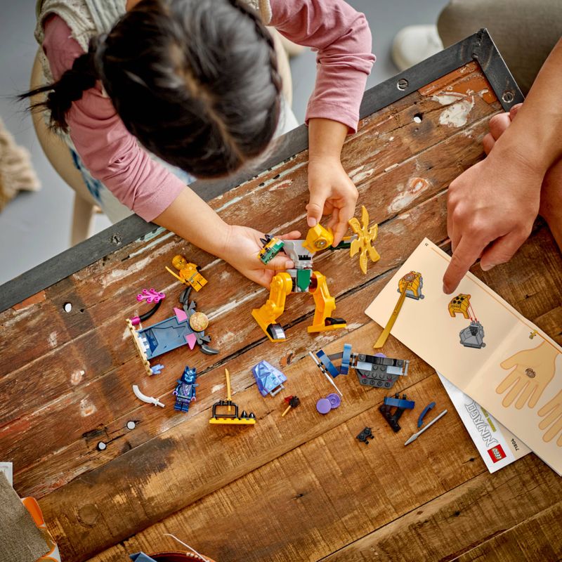 O brinquedo ninja Battle Mech (71804) de Arin permite que crianças a partir de 4 anos aprendam a construir enquanto se juntam à tentativa de seus heróis ninja de salvar seus amigos dragões. Este brinquedo de ação inclui uma figura mecânica impressionante para inspirar as crianças a recriar aventuras emocionantes da 2ª temporada do programa de TV NINJAGO® Dragons Rising.