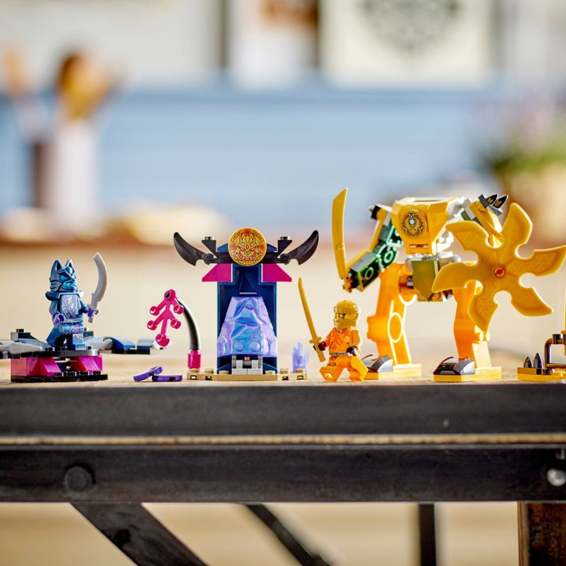 Este conjunto LEGO® vem com 2 minifiguras: Arin com um acessório de katana e um Wolf Mask Warrior com um acessório de espada. Arin se encaixa na figura mech articulada, que empunha uma espada grande e uma lâmina giratória, enquanto o Wolf Mask Warrior pode voar em um planador que possui asas articuladas, um atirador de disco e 2 lanças. Há também uma caverna de cristal construída em tijolos com um martelo mágico dentro e um porta-armas com 2 acessórios de espada katana dourada.