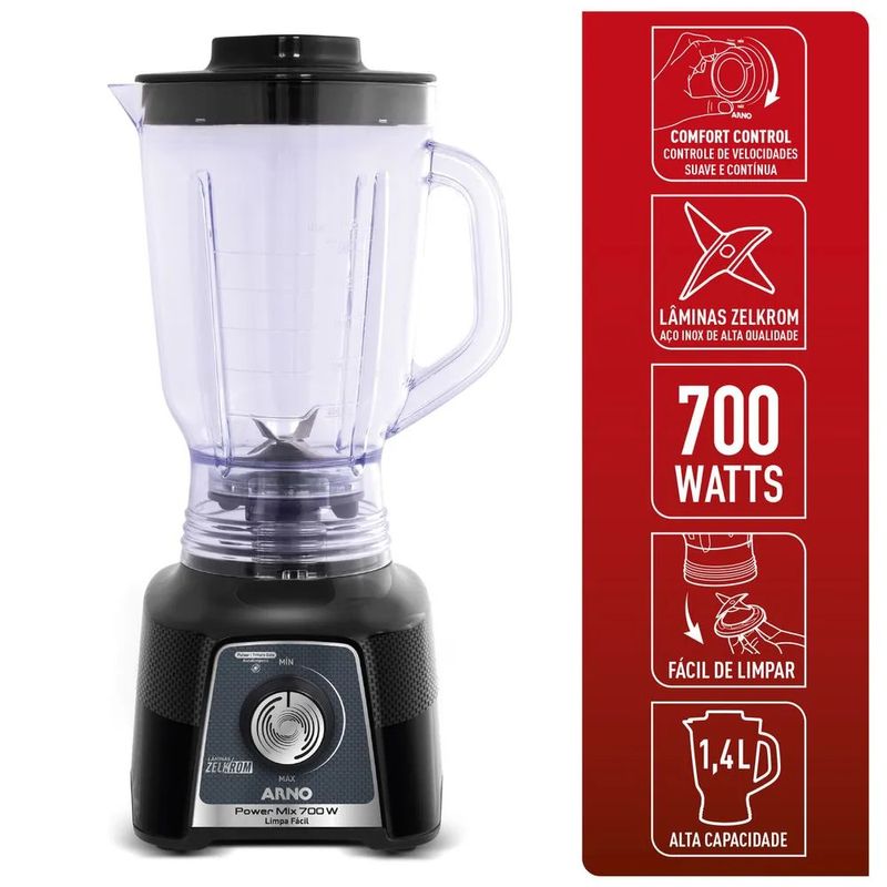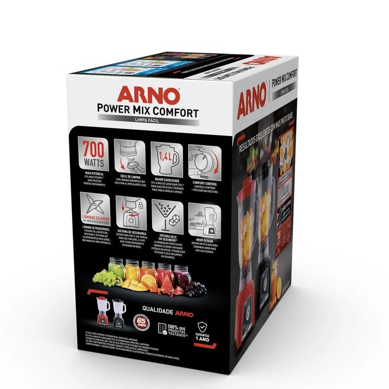 Não sei meu CEPO que era ótimo está ainda melhor! Tenha em mãos o novo Liquidificador Arno Power Mix Limpa Fácil com sistema super seguro de lâmina removível que facilita a limpeza deixando mais tempo para você aproveitar os bons momentos com sua família e amigos, agora com novo design, mais potente e com maior capacidade! Tenha mais precisão e conforto no manuseio do seu Power Mix como nunca: escolha a velocidade ideal para o preparo de suas receitas com o novo sistema contínuo de controle exclusivo Comfort Control! Com a qualidade de quem é especialista em liquidificadores há mais de 65 anos, o novo Liquidificador Arno Power Mix Limpa Fácil possui lâminas Zelkrom, de aço inox ultradurável que possibilita liquidificar, misturar e triturar até os ingrediantes mais duros. Tudo isso sem manchar, enferrujar ou perder o corte. Com a tecnologia do sistema de limpeza Limpa Fácil, basta remover a lâmina do copo do liquidificador de forma rápida e fácil, enxaguar, fixar novamente e, pronto, seu Liquidificador Arno Power Mix Limpa Fácil está pronto para ser usado novamente! Aproveite tudo o que o Power Mix pode oferecer com aumento de capacidade útil para 1,4L e nova potência de 770W! O liquidificador Power Mix é potente por dentro e moderno por fora, com novo corpo texturizado para combinar com sua cozinha. Novo Liquidificador Power Mix 770W. Resultados excelentes com mais praticidade. Você imagina, clic, a Arno faz!