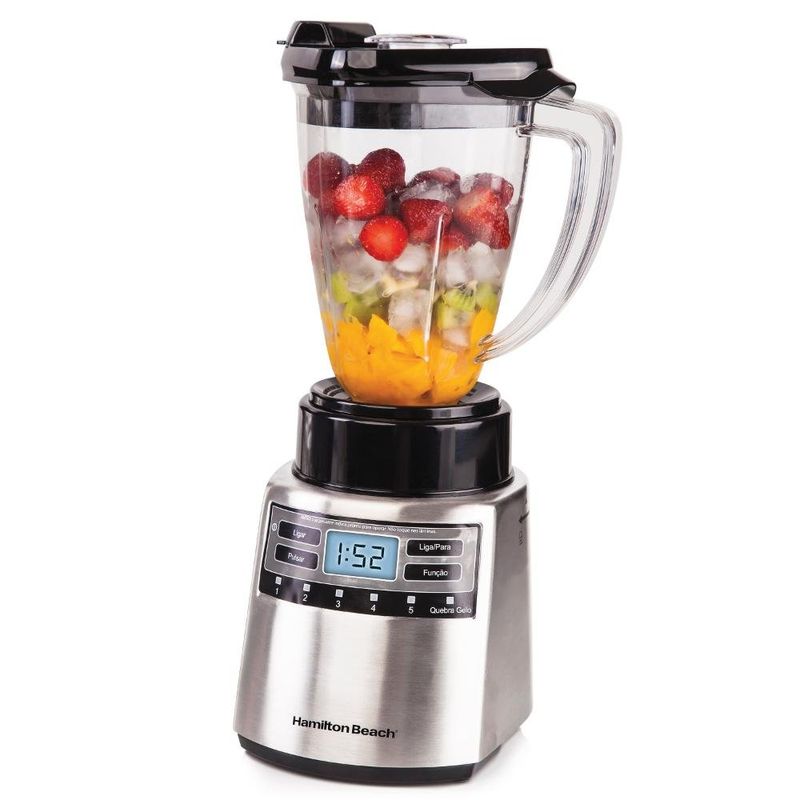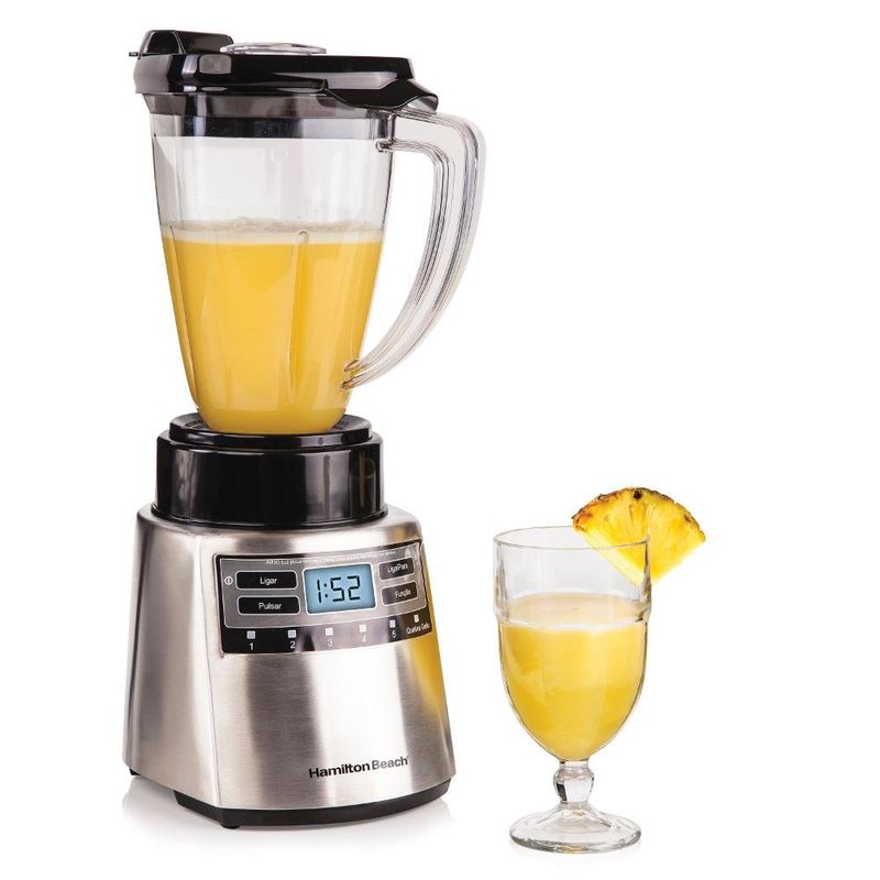 O Liquidificador Digital Hamilton Beach tem 700 watts de potência máxima e jarra de Titan™, um material super-resistente a impactos e temperaturas. Com este liquidificador você não precisa ter medo de misturar massas mais pesadas ou até mesmo gelo. Além de forte, ele é lindo, moderno e inteligente. A base de metal tem painel plano, que facilita a limpeza; e função de contagem regressiva, que deixa o aparelho ligado no automático por dois minutos.
