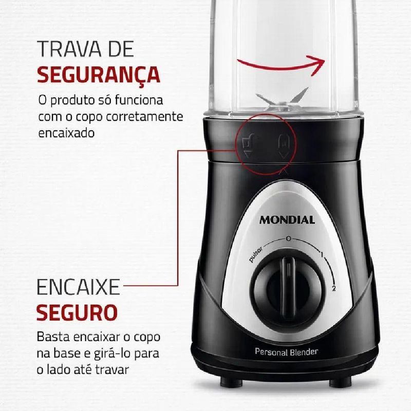 Leve suas bebidas favoritas para onde quiser com o Personal Blender da Mondial. Com 300W de potência, ele é capaz de preparar sucos, vitaminas, shakes e coquetéis com eficiência. Seus 2 copos de 750ml são super-resistentes e se transformam em squeeze, facilitando o transporte para a academia, escritório ou qualquer outro lugar.As lâminas em aço inox do Personal Blender são ideais para triturar frutas e até cubos de gelo. Além disso, o produto tem design compacto e é desmontável, o que facilita o armazenamento. Os pés antiderrapantes mantêm o produto estável durante o uso, proporcionando mais segurança para o usuário.Com o Personal Blender, é possível conciliar vida saudável e praticidade. Com a correria do dia a dia, muitas vezes é difícil manter uma alimentação saudável, mas o Blender da Mondial facilita esse processo, permitindo que você prepare suas bebidas favoritas de forma rápida e prática. Leve suas bebidas para onde quiser e mantenha os bons hábitos alimentares.Especificações técnicas:- Marca: Mondial