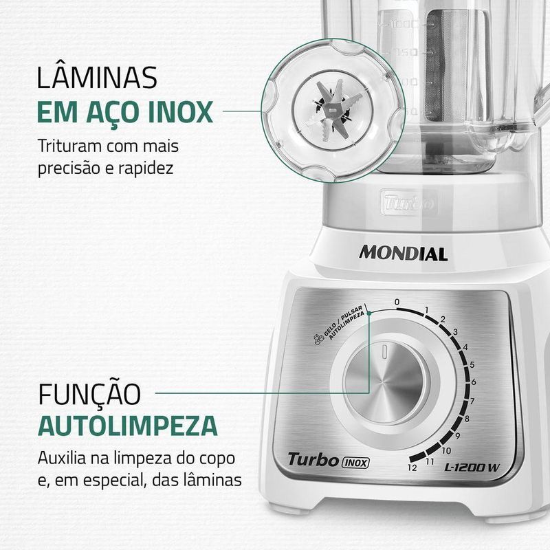 O Turbo Inox L-1200W é a escolha perfeita para preparar receitas ‘tamanho família’ e de uma só vez. O liquidificador Mondial tem de potência, jarra com 3 litros de capacidade total e 12 velocidades. Características ideais para economizar seu tempo e tornar a cozinha um lugar de praticidade. Prepare torta de frango, bolo de milho, pão de queijo, massa de panqueca, queijadinha e muitas outros pratos com agilidade. Saiba mais sobre o liquidificador L-1200-WI: