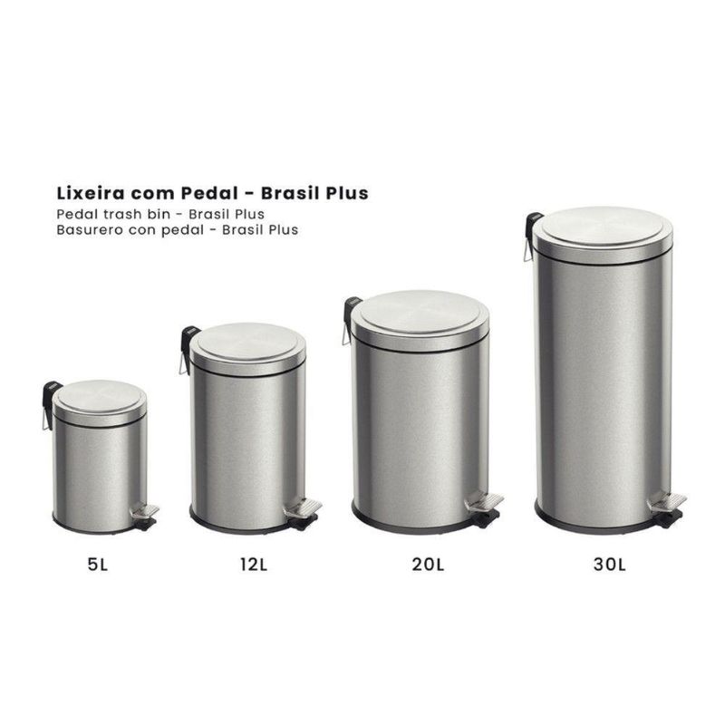 Lixeira Inox com Pedal 20 L Acabamento Scotch Brite e Balde Interno Removível TramontinaOrganização e beleza é com a Lixeira Inox com Pedal Tramontina Brasil Plus Acabamento Scotch Brite e Balde Interno Removível 20 L. Além da tampa com amortecedor que garante um fechamento suave, a lixeira fica aberta mesmo sem o pedal estar pressionado, facilitando o depósito dos resíduos. Fabricado em aço inox com acabamento Scotch Brite, conta ainda com balde interno removível, alça de transporte e ventosa na base para melhor fixação no chão. São 20 L de capacidade para te auxiliar diariamente.Lixeira Inox com Pedal 20 L Acabamento Scotch Brite e Balde Interno Removível Tramontina - Especificações TécnicasMaterial: Aço Inox AISI 430Espessura: 0,4 mmAcabamento: Scotch BriteTratamento anti digitais: NãoAlça para transporte: SimAbertura: PedalTampa: Sim, com sistema Stay OpenFechamento suave da tampa: NãoBalde plástico removível: SimCapacidade: 20 LSaco de lixo recomendado: 30 - 40 LDimensões Produto (Compr. X Larg. X Alt.): 29,5 x 29,5 x 46 cmLixeira Inox com Pedal 20 L Acabamento Scotch Brite e Balde Interno Removível Tramontina - Na sua casa!