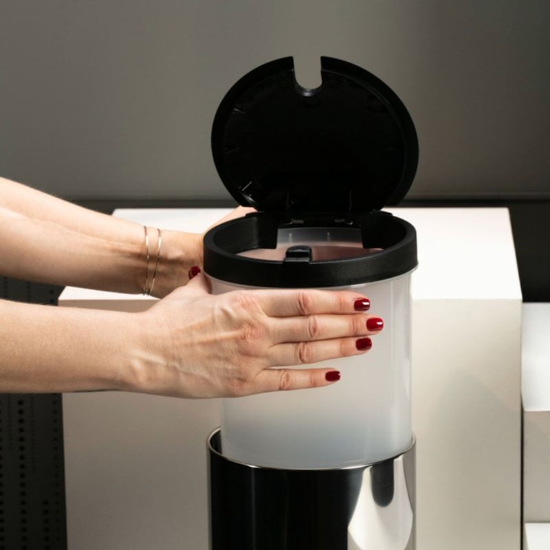 Com estilo e praticidade, a lixeira Press tem um balde interno com capacidade de 4 litros. Ele pode ser retirado para facilitar a limpeza. Outro fator que auxilia a higienização é o corpo em aço inox. Para incrementar a decoração, a tampa é colorida e está disponível em vermelho, preto e branco. Ideal para formar um conjunto com o organizador de pia multiuso que está disponível nas mesmas cores.