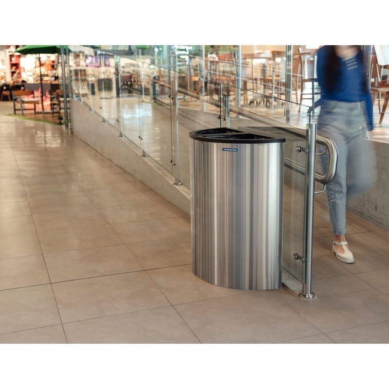 Lixeira Tramontina Abruzzo Inox Acabamento Acetinado 110 LPara deixar ambientes institucionais muito mais organizados e agradáveis, a lixeira Tramontina Abruzzo em aço inox 110 litros é a escolha ideal. Cheia de estilo, moderna e com acabamento acetinado, ela é uma lixeira totalmente produzida em aço inox AISI 430, que conta com aro em aço carbono com pintura eletrostática, ambas características que garantem maior resistência e durabilidade a intempéries. Sua capacidade é de 110 litros. Escolha as lixeiras Tramontina e deixe seu ambiente empresarial ainda mais funcional!Material (corpo): Aço Inox AISI 430Espessura: 0,6 mmAcabamento: AcetinadoTratamento antidigitais: NãoMaterial (tampa): Aço carbono com pintura eletrostática a pó preto foscoPegador para transporte: NãoTampa: NãoAramado interno para fixação do saco de lixo: SimBalde plástico: NãoAcompanha adesivos de coleta seletivaCapacidade: 110 LSaco de lixo recomendado: 200 LTodas as imagens são meramente ilustrativas.Cuidados com o produto Produto para uso interno. Para a limpeza, lavar com uma esponja macia e detergente neutro. Nunca deixar objetos metálicos por muito tempo em contato com a lixeira, para evitar a corrosão. Evitar o contato com ácido muriático, água sanitária ou qualquer outro solvente que possa vir a agredir o produto. Para manter o brilho da sua lixeira, recomenda-se o uso da pasta para polir e remover manchas em superfícies de aço inoxidável Tramontina. Não utilizar para limpeza, palha de aço inox ou outros elementos ou produtos que possam riscar o aço inox.Garantia1 ano (90 dias de garantia legal acrescidos de 09 meses de garantia contratual) para vicios ou defeitos de fabricação. Termo de garantia disponível em Certificações/Normas. - -