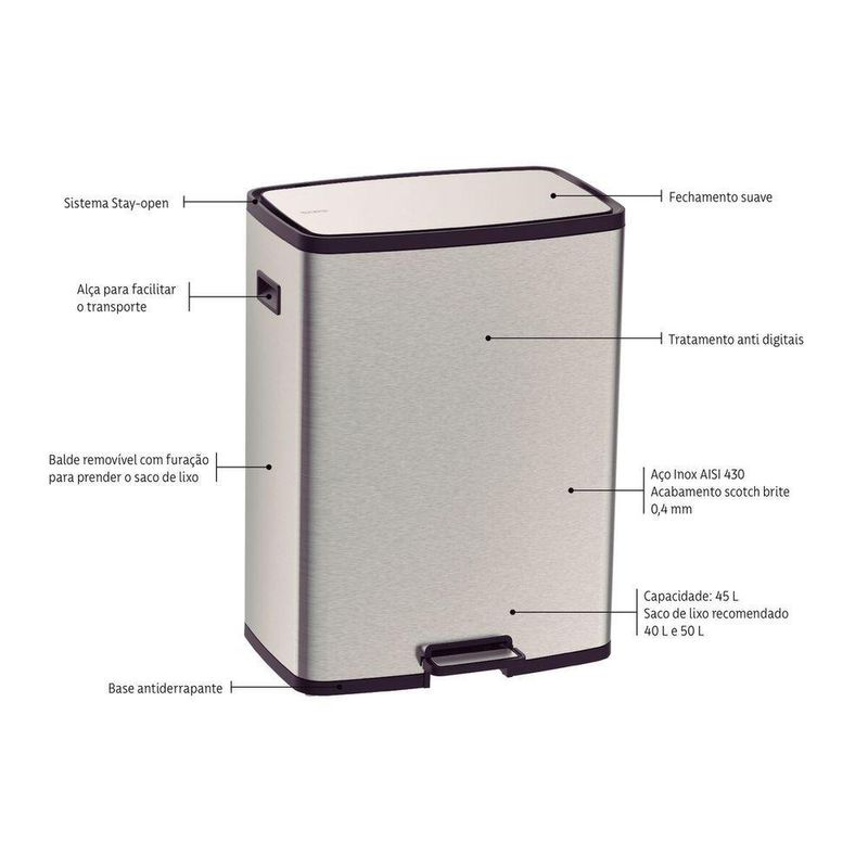 Material: Aço Inox AISI 430Espessura: 0,4 mmAcabamento: Scotch BriteTratamento anti digitais: SimAlça para transporte: SimAbertura: PedalTampa: Sim, com sistema Stay OpenFechamento suave da tampa: SimBalde plástico removível: SimCapacidade: 45 litrosSaco de lixo Tramontina: 65 litros, letra OSaco de lixo recomendado: 40 - 50 litros