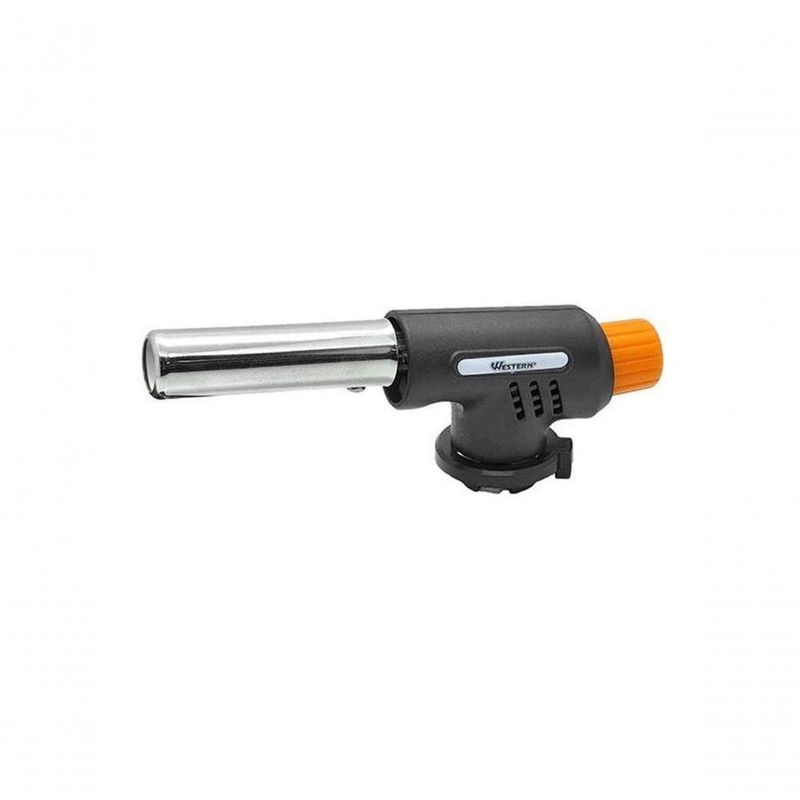 Descricao - Caracteristicas: Utiliza refil de gas butano (nao incluso); Tempo Maximo de 2 minutos de uso continuo; Controle manual da chama; Botao de acendimento. Possui revestimento interno termico em ceramica. - Antes do uso: Verificar se o produto esta em perfeitas condicoes de uso ou instalacao. - Perigos: Ao manusear produtos quentes, proteja as suas maos; Cuidado durante o manuseio do produto para evitar acidentes; Evite quedas e pancadas para nao danificar o produto. *Imagens meramente ilustrativos. Especificacao Tecnica - Contem: 1 Macarico: 15,4 x 4 x 5,5cm (CxLxA) - Dimensoes da Embalagem: 14 x 4 x 20,5cm (CxLxA) - Tipo de Embalagem: Blister - Quantidade Inner: 10 Pecas - Dimensoes Inner: 33 x 13 x 20,3cm (CxLxA) - Quantidade Master: 40 Pecas - Dimensoes Master: 34 x 29 x 43cm (CxLxA) - Material: ABS (Acrilonitrila butadieno estireno), Aco inoxidavel e Liga de zinco - Marca: Western - Cor: Preto, Prata e Laranja